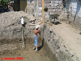 The latest news is that the architect made a boo-boo when she drew the plan. The house (and basement) will now be three metres longer than was originally planned, which means that the old cow shed (at the right of the pic above) has had to be demolished before the foundations can be finished. Just the long drop toilet is left.